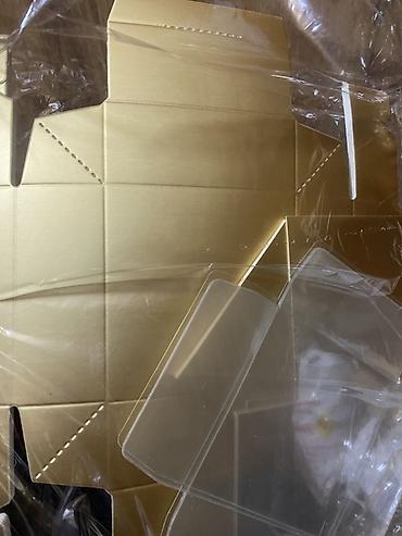 - Набор заготовок для сборки коробок: жесткое основание из золотистого картона с прозрачными ПЭТ-стенками и внешняя обложка из плотного зелёного картона.
