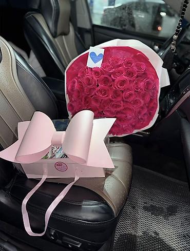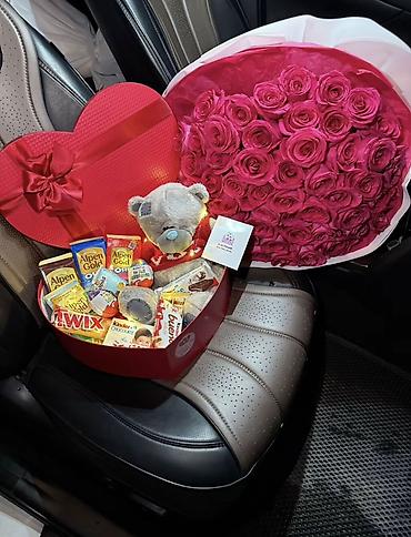 2) Сердечная коробка с ассортиментом сладостей + мини-мишка с огоньками + крупный букет ярко-розовых роз.