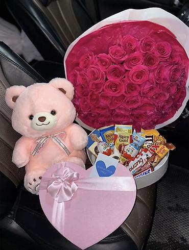 3) Розовый мишка + круглая коробка-сердце со сладостями + букет роз.
