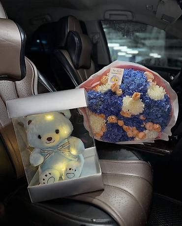 - Мягкие игрушки мишки разных оттенков (белый, розовый, голубой), с атласными лентами; варианты в прозрачной подарочной коробке с декоративной подсветкой или без неё.