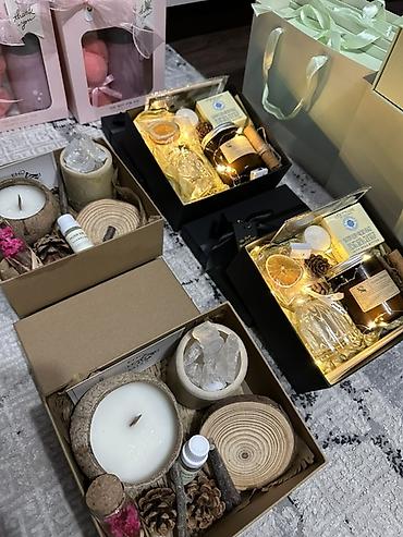 Состав можно комбинировать по вкусу: уют (кружка + плед + свеча + конфеты), бьюти/спа (косметика + свечи + диффузор), эко‑натура (соевые свечи, эфирное масло, декор из дерева/шишек).