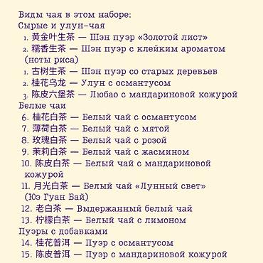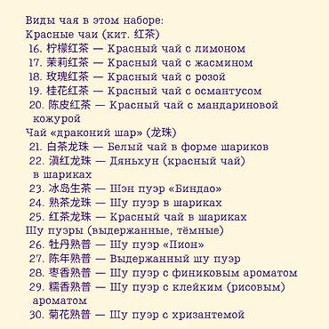 Упаковка: подарочные пакеты с открыткой-ярлыком. Отлично подходит для дегустации китайских чаёв и знакомства с разными стилями и ароматами: цветочные, цитрусовые, травяные, рисовые, пряные и выдержанные. Каждый вид — отдельная порция. ++