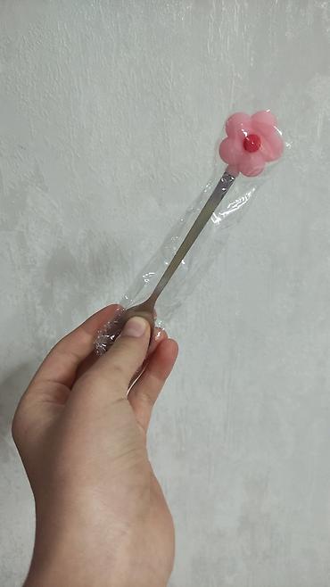 - Десертная ложка из металла с декоративной насадкой в виде розового цветка.