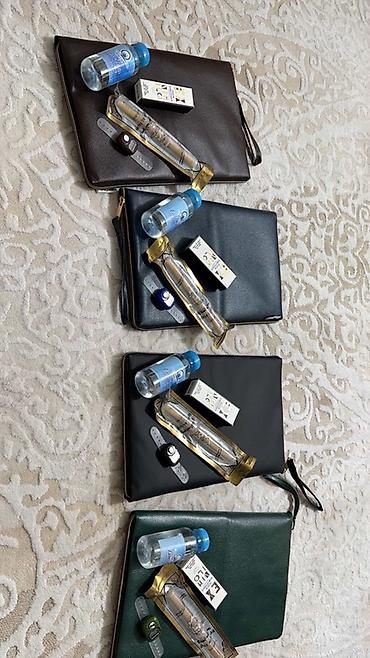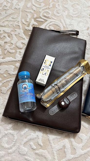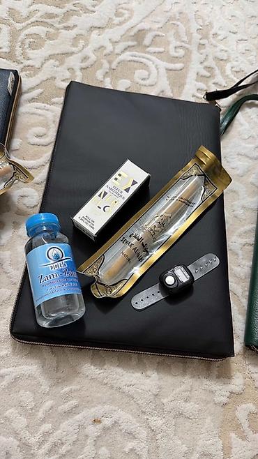 Набор продуман для паломника: клатч помогает хранить паспорта и ваучеры, вода Зам‑Зам и мисвак — для соблюдения сунны и гигиены, счетчик — для зикра, компактные масляные духи без спирта — для аккуратного нанесения аромата. Подходит как практичный подарок перед поездкой.
