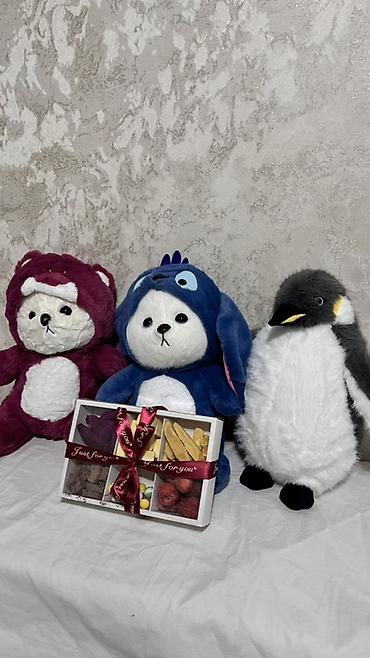 - Мягкая игрушка на выбор: пингвин, синий зверёк с длинными ушками, либо бордовый мишка в костюмчике. Плюш очень мягкий, выразительная мордочка, устойчиво сидят на поверхности. Отлично для детской комнаты или как уютный декор.