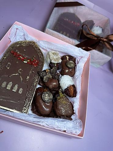 - Внутри: крупные финики, украшенные и покрытые бельгийским шоколадом (молочным и белым), с разными топпингами: орехи (миндаль, фисташка), кокосовая стружка, съедобное золото/пыль, шоколадные и сахарные декоры.