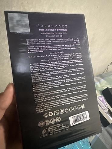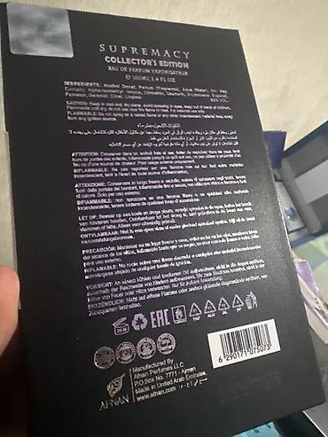 - Afnan Supremacy Collector’s Edition, Eau de Parfum, 100 ml (U.A.E.). Полная презентация с коробкой. На обороте — информация о составе, пиктограммы, штрих‑код , маркировка EAC.