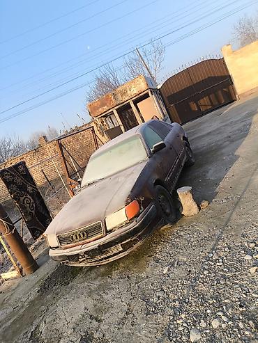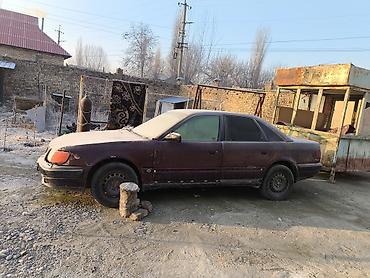 Автомобиль Audi 100 в кузове седан бордового цвета. Машина имеет четыре двери и стальные диски. Присутствуют фары головного света и задние фонари. Задние стекла имеют тонировку. Автомобиль находится в изношенном состоянии, с видимыми следами эксплуатации и загрязнениями. На передней части автомобиля установлена характерная для Audi решетка радиатора и противотуманные фары.