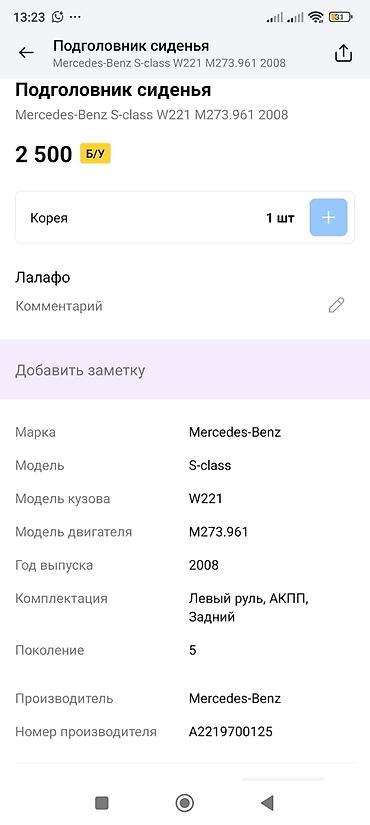 Подголовник сиденья в сборе для Mercedes‑Benz S‑Class W221 (пятое поколение), двигатель M273.961, год 2008. Оригинальная деталь Mercedes‑Benz, номер производителя A5.