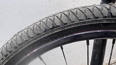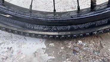 - Колёса 20" на ободах 406 мм (покрышки 57‑406 / 20×2.25); задняя покрышка — полуслик с алмазным рисунком, передняя — более цепкая универсальная.