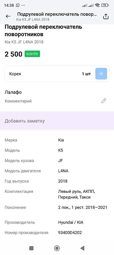 Подрулевой переключатель поворотников (левая/правая рулевая колонка с блоком шлейфа и рычагами света/дворников) для Kia K5 JF, двигатель L4NA, год 2018.