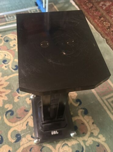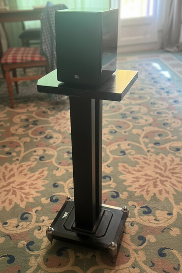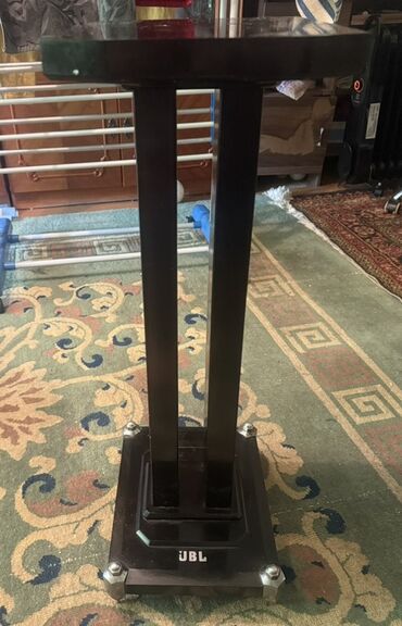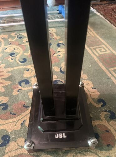 Черные подставки для акустической системы. Подставка состоит из квадратного основания с серебристыми ножками, вертикальной стойки и верхней площадки для установки акустической системы. Подставка обеспечивает устойчивое и надежное размещение акустики, а также позволяет оптимизировать ее положение для лучшего звучания. Вес одной подставки 18 кг.