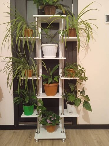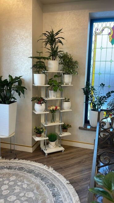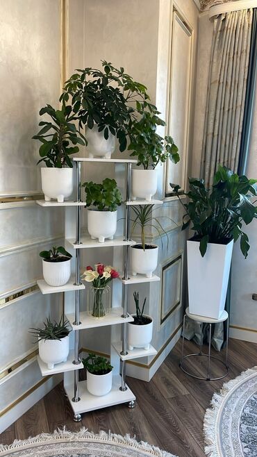 Элегантная многоярусная подставка для цветов, выполненная в современном стиле. Конструкция включает прямоугольные полки белого цвета, расположенные на разных уровнях, и хромированные вертикальные опоры. Подставка оснащена семью отдельными полками, что позволяет разместить большое количество растений. Каждая полка имеет достаточно пространства для цветочных горшков различных размеров. Стильное и функциональное решение для размещения комнатных растений, которое гармонично впишется в интерьер гостиной, спальни или офиса. Прочная конструкция обеспечивает надежное размещение растений и ваз.