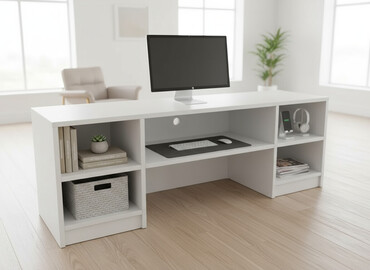 Тумба ТВ/медиатумба с двумя распашными шкафчиками и открытой секцией по центру. Особенности: - Форм‑фактор: низкая тумба на устойчивых черных ножках - Планировка: 2 закрытых отсека по краям + цент...