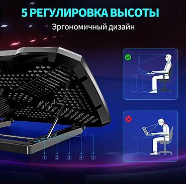 Вентилятор охлаждения ноутбука имеет металлическую планку эргономичного дизайна в нижней части, которая обеспечивает механизм подъема, а 5 регулируемых по высоте подставок увеличивают пространство для ноутбука и стола, что способствует отводу тепла от ноутбука и последующему снижению температуры.