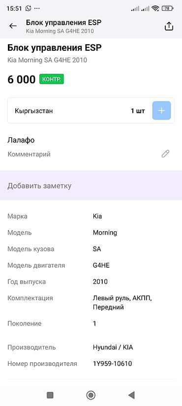 - Для моделей: Kia Morning (Picanto) SA, двигатель G4HE, год выпуска 2010 (поколение 1). Совместимость уточняйте по номеру 95910-1Y610/1Y959-10610.