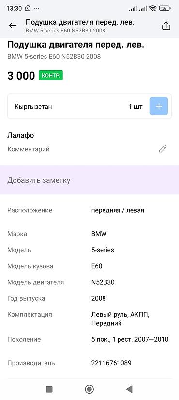 Подушка двигателя передняя левая для BMW 5-Series E60 (рестайлинг 2007–2010), двигатель N52B30, год 2008.