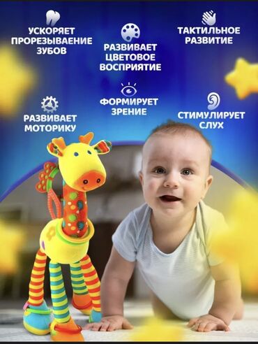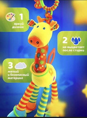 Игрушка представлена в виде прекрасного жирафика. Мягкая и интересная, эта погремушка подвеска станет надежным компаньоном вашего ребенка как в коляске, так и в кроватке или автокресле. Самая лучшая подвеска для развития маленького жизнерадостного человечка!