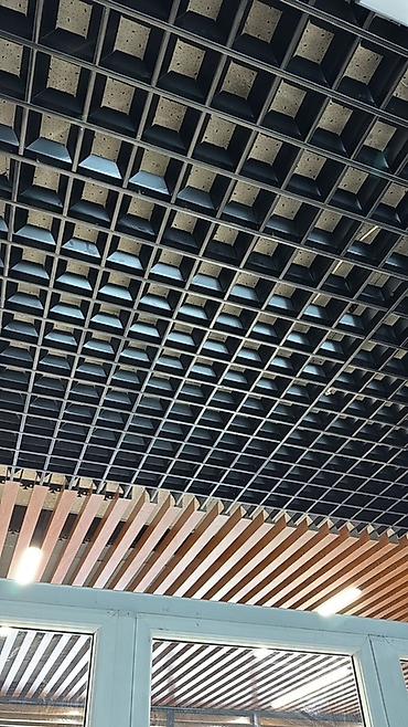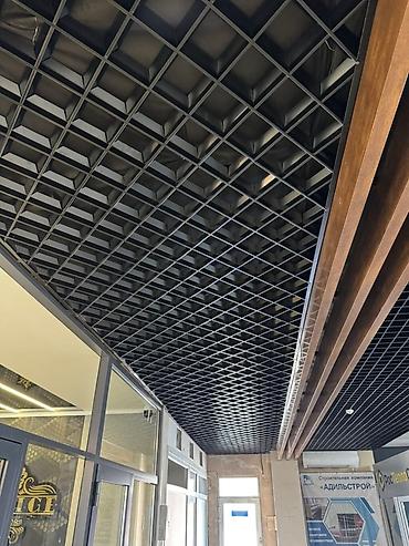 - Конструкция: квадратные ячейки на несущих Т‑профилях; открытая структура с возможностью скрыть коммуникации