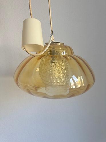 Подвесной светильник (люстра) с абажуром из прозрачного янтарного стекла. Светильник создает мягкое и рассеянное освещение. Подходит для использования в гостиной, спальне или столовой.