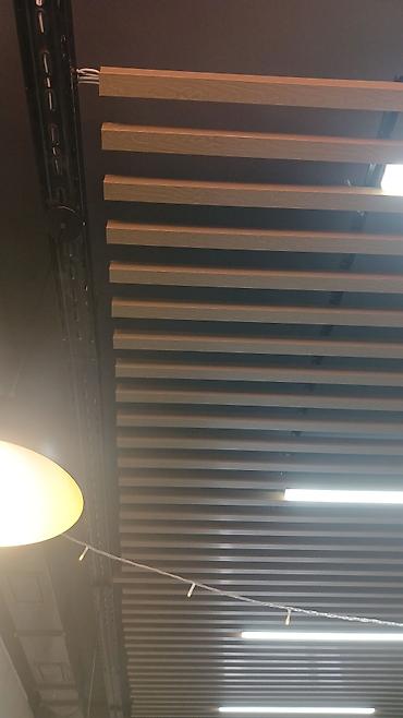 - Ламели линейного потолка с отделкой под дерево теплого тона.