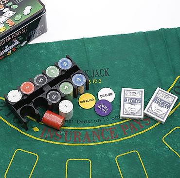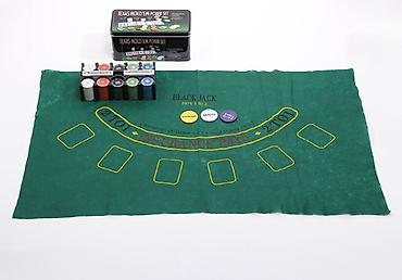 Набор для домашнего блэкджека. Состав: - Зелёное игровое сукно с разметкой стола для Black Jack: зоны для ставок, поля для карт, надписи «BLACK JACK PAYS 3 TO 2» и «INSURANCE PAYS 2 TO 1», разметк...
