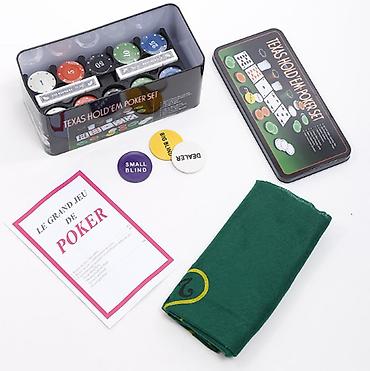 Набор для покера Texas Hold’em в металлической коробке. Состав: - Покерный сукно-коврик 36" x 24" (примерно 91 x 61 см). - 200 профессиональных фишек разного номинала (синие, зеленые, красные, бел...