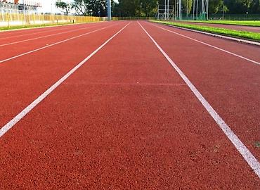 Резиновое покрытие для беговых дорожек с разметкой. Покрытие имеет несколько дорожек, разделенных белыми линиями, с нанесенными номерами. Подойдет для обустройства спортивных площадок, стадионов и тренировочных зон.
