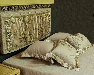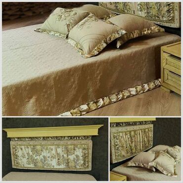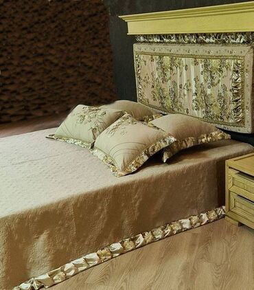 Элегантное покрывало в тёплых бежево-золотистых тонах с изысканным цветочным узором. Нижняя часть оформлена мягкой складчатой оборкой, придающей постели объём и завершённый вид. Комплект дополнен декоративными подушками в тон с кантом и вышивкой — идеально сочетается с классическим и уютным интерьером спальни.