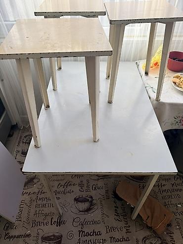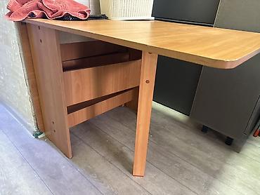- Стол кухонный/письменный из ЛДСП под бук/вишню с прямоугольной столешницей и опорной тумбой-органайзером (две открытые секции для хранения под столешницей). Подходит как рабочее место или обеденный стол для небольшой кухни.