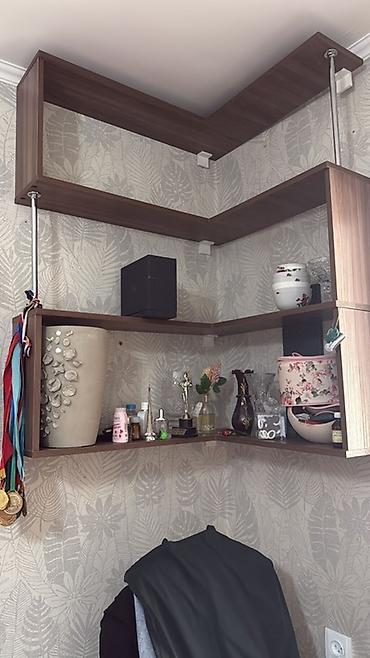 - Угловая модульная система полок из ЛДСП под дерево. Три открытых уровня, верхняя полка закреплена металлическими штангами к потолку для жесткости. Подходит для книг, декора, посуды, наград. Крепления к стене и потолку уже установлены.