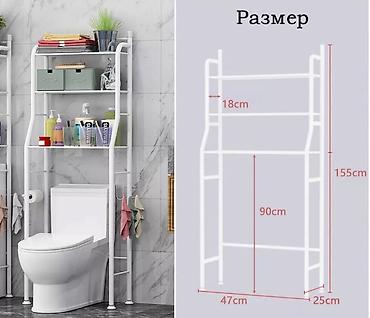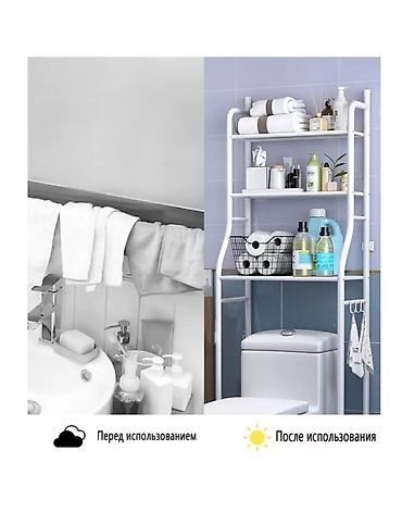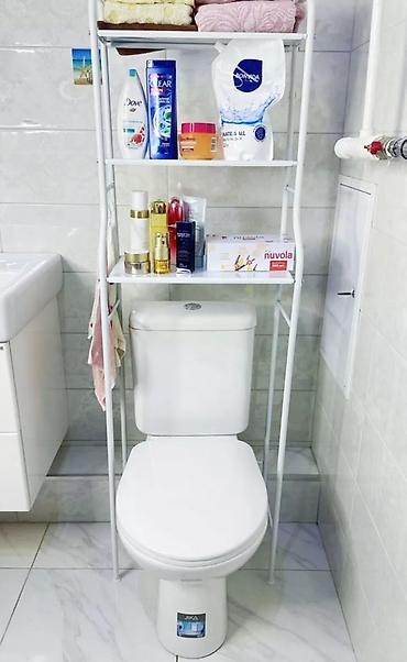 - Конструкция: напольный стеллаж, устанавливается над унитазом. Три полки + боковые крючки/держатели для полотенец и мелочей.