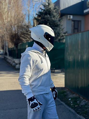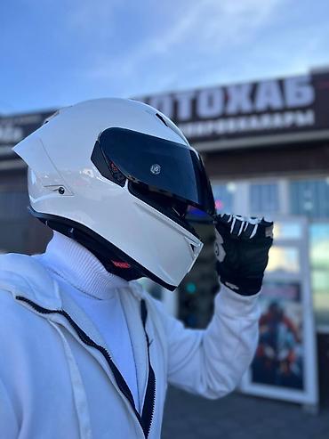 Полноразмерный мотошлем (фулл-фейс) в белом цвете с затемнённым визором.