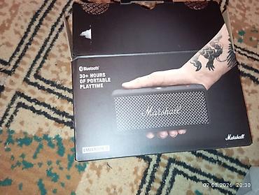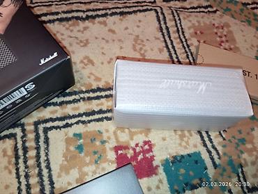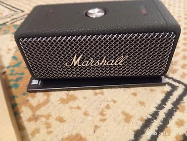 - Компактная колонка в фирменном дизайне Marshall с металлической решёткой и логотипом.