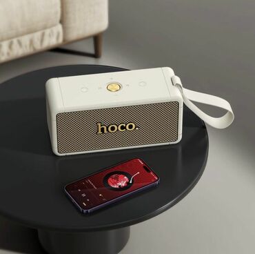 Портативная Bluetooth-колонка Hoco. в черном корпусе с золотистым логотипом и элементами управления. Имеет текстурированную поверхность и удобный ремешок для переноски. На верхней панели расположены кнопки управления, а на задней — порты подключения. Подходит для использования дома, в офисе или на природе для воспроизведения музыки со смартфона или других устройств. Компактный размер и стильный дизайн делают ее идеальным спутником для любителей музыки.