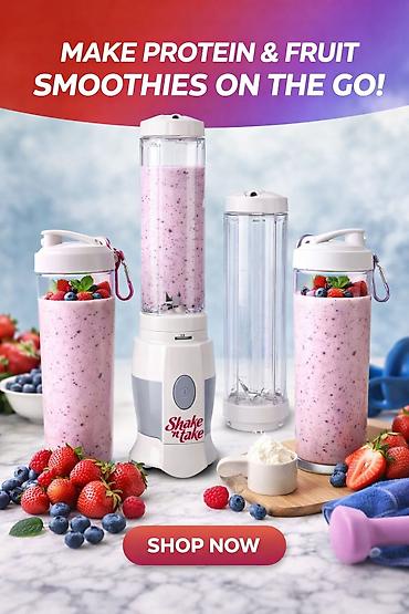Здоровое питание с Портативным блендером Shake ’n Take — компактная система «смешай и бери с собой» для смузи, коктейлей и протеиновых шоколадных шейков. Акция: 2 блендера покупаете, третий в подарок!