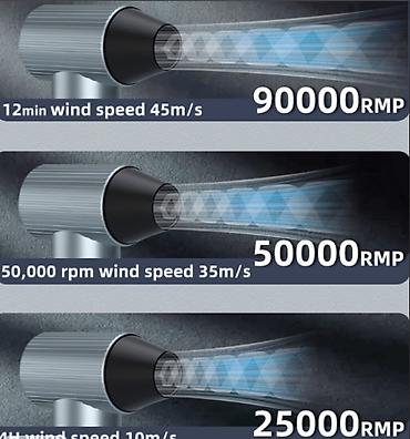 • 90 000 об/мин — поток до 45 м/с (около 12 мин работы на максимуме)