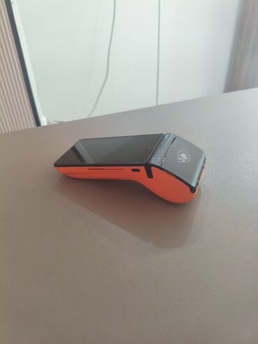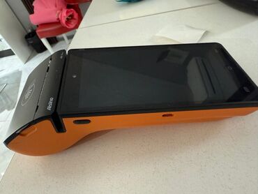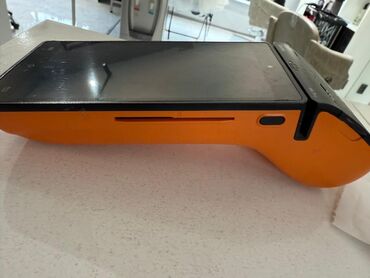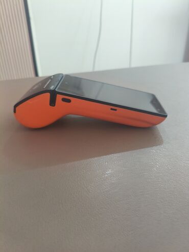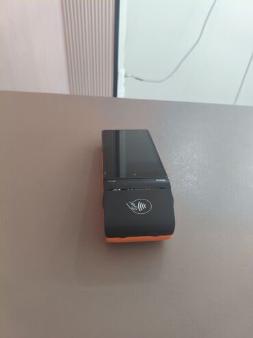 Портативный POS-терминал в оранжево-черном корпусе. Устройство оснащено экраном и слотом для карт, что обеспечивает удобство проведения транзакций. Поддерживает бесконтактную оплату, что делает его универсальным решением для различных торговых точек и предприятий сферы услуг. Идеально подходит для мобильной торговли, курьерских служб и небольших магазинов.