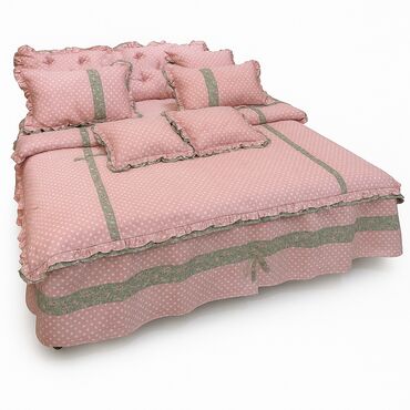Комплект постельного белья с крупными рюшами и цветочным декором 🌸 Нежный и уютный комплект постельного белья в винтажном стиле. Основная ткань — розовая с белыми горошками, украшена зелёными вста...