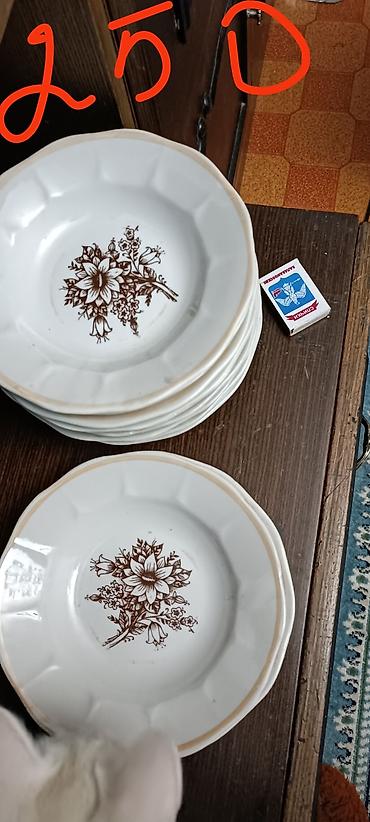 Продаю: 1. Блюдо глиняное, диаметр 36 см., цена 200 сом; 2. Тарелки фарфоровые СССР, с зелёной каймой, в наличии 18 шт, цена за все 950 сом; 3. Тарелки фарфоровые, белые без рисунка, 5 шт, цена за...
