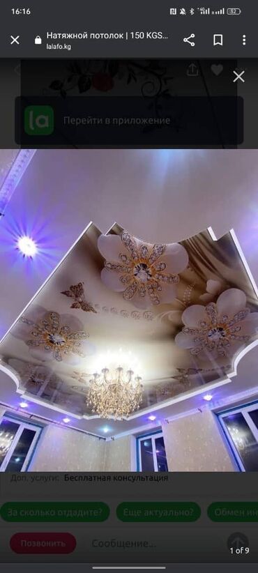 Натяжные потолки Натяжные потолки Натяжные потолки 170 сом кв. м полотно 200 сом работа погоннный метр. Натяжные потолки быстро и качественно без запаха, материал премиум класса. ЗАМЕР КОНСУЛЬТАЦ...