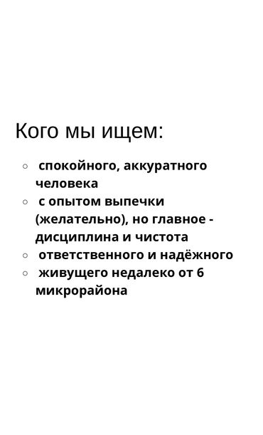 Небольшая кулинария ищет аккуратного, спокойного и ответственного человека.