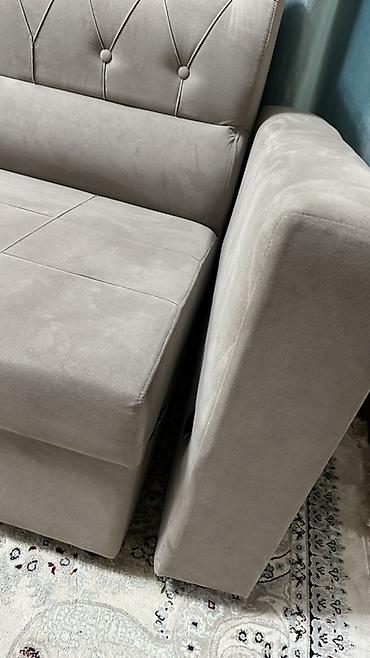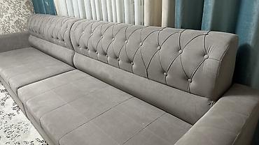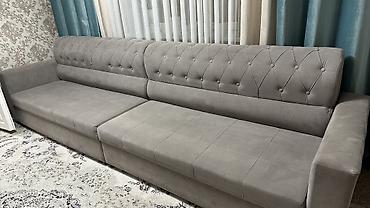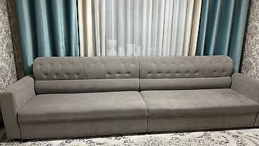 Ширина 90 длина 3.6м 4 местный Прямой диван большого размера, серый, обит мягкой велюровой тканью. Спинка с декоративной стяжкой «капитоне» на пуговицах, ровные подлокотники. Сиденье широкое, из крупных модулей с прострочкой квадратами; удобная поддерживающая подушка по всей длине спинки. Конструкция модульная: видны секции, которые стыкуются в единую длинную посадочную зону и могут раздвигаться для увеличения спального места. Низ закрыт цельным цоколем — визуально аккуратный, без видимых опор. Цвет универсальный тёплый серый, легко сочетается с любым интерьером.