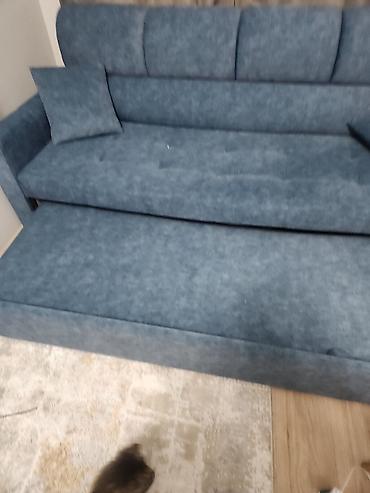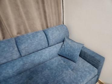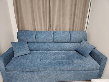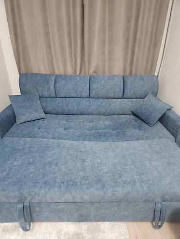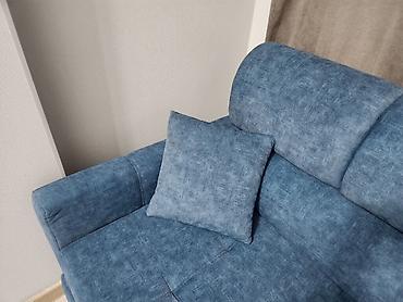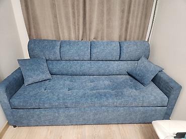 Диван прямой раскладной, ткань — мягкий износостойкий велюр/рогожка синего цвета с легкой фактурой. Прямая форма с высокими подушками-спинками из 4 секций и широкими подлокотниками. В комплекте 2 декоративные подушки.