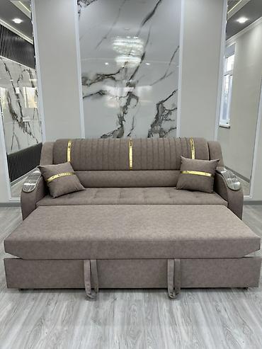 - Дизайн: современный, обивка в теплой бежево‑коричневой гамме с декоративными вертикальными строчками на спинке и акцентными золотистыми лентами. Подлокотники с накладками под «дерево» для защиты ткани.