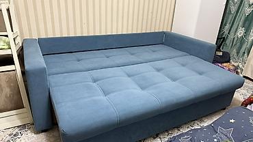 Прямой раскладной диван синего цвета с мягкими подушками спинки (3 шт.) и вместительным бельевым ящиком.