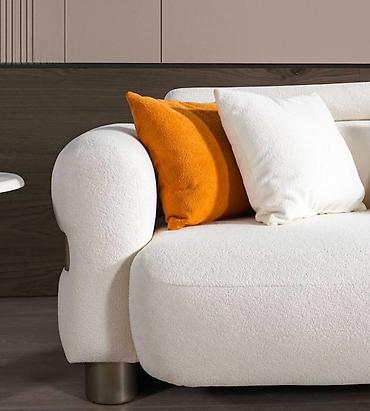 - Обивка: текстурная букле/шерстистая ткань молочного цвета, тактильно мягкая, визуально объемная.