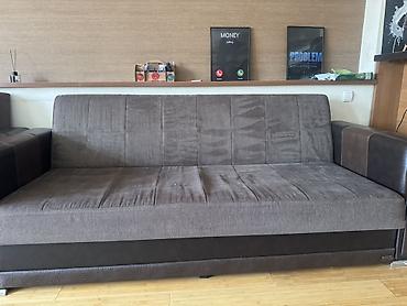 Прямой диван с раскладным механизмом-книжкой. Плюс комплект два кресла ! - Размеры ориентировочно: длина около 2,1–2,2 м; глубина сиденья ~60 см; высокая спинка. - Обивка: мягкая ткань темно‑корич...