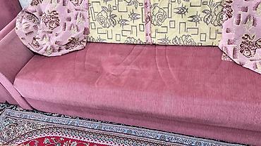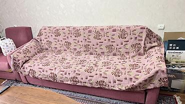 Диван раскладной, тканевая обивка розового цвета. Прямой, на ножках‑опорах, с подлокотниками. Сиденье и спинка мягкие; спинка выполнена из трех секций-подушек. Есть механизм раскладывания в полноценное спальное место (книжка/клик-клак — раскладывается вперед). Низ закрыт цельной царгой. В комплекте — чехол/покрывало с узором и три декоративные подушки со светлым орнаментом.