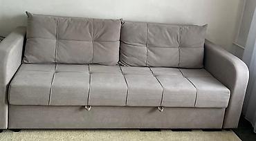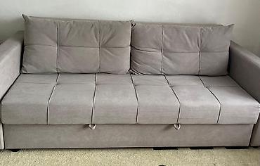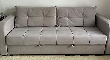 Раскладной диван-кровать, обитый мягкой серой тканью. - Прямые формы, широкие подлокотники, стежка на спинке. - Механизм трансформации: выкатной/еврокнижка (сиденье выдвигается, спинка опускается...